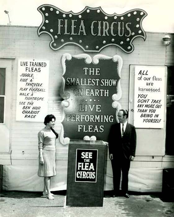 Maria and John Torp, newly weds and their traveling Flea Circus, prepare to hit the road and start life from scratch with the performing fleas. (via Sideshow World)